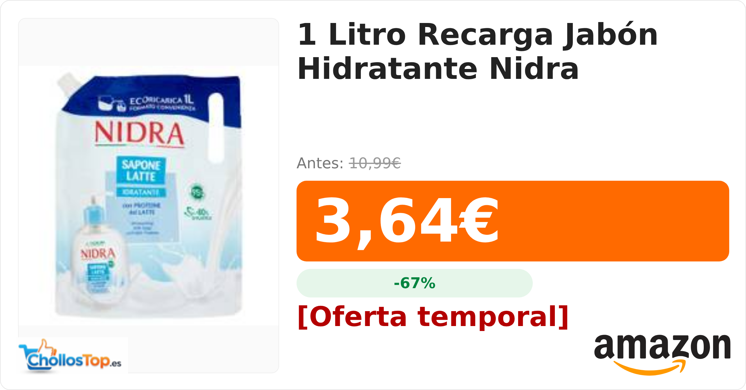 🔥 1 Litro Recarga Jabón Hidratante Nidra BY ChollosTopEs septiembre 9, 2025 1 Litro Recarga Jabón Hidratante Nidra 💰 Precio actual: 3.64€ 🪙 Antes: 10.99€ 📉 Descuento: -67% Ir al chollo