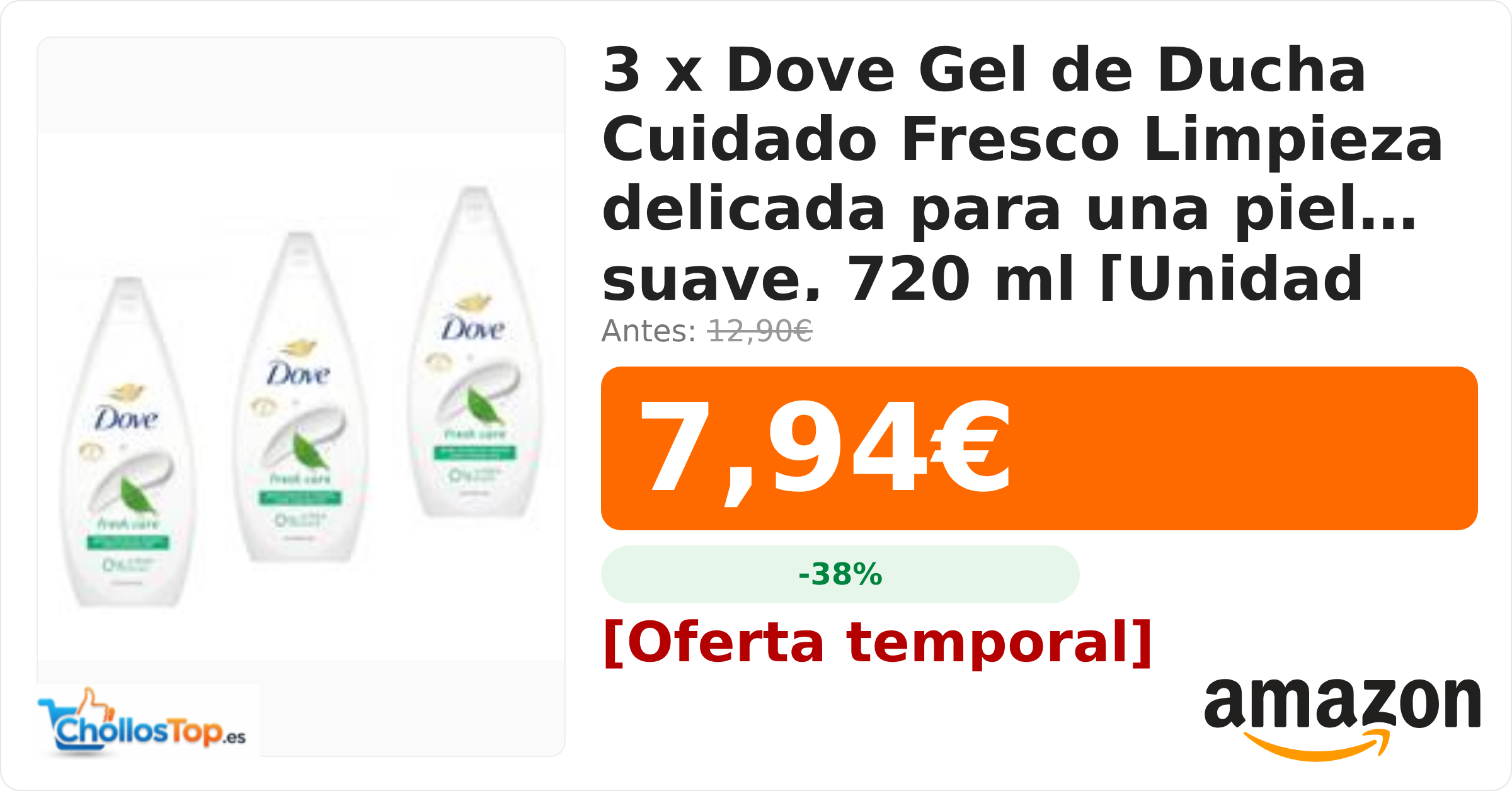 🔥 3 x Dove Gel de Ducha Cuidado Fresco Limpieza delicada para una piel suave, 720 ml [Unidad 2'64€] BY ChollosTopEs septiembre 9, 2025 3 x Dove Gel de Ducha Cuidado Fresco Limpieza delicada para una piel suave, 720 ml [Unidad 2'64€] 💰 Precio actual: 7.94€ 🪙 Antes: 12.9€ 📉 Descuento: -38% Ir al chollo