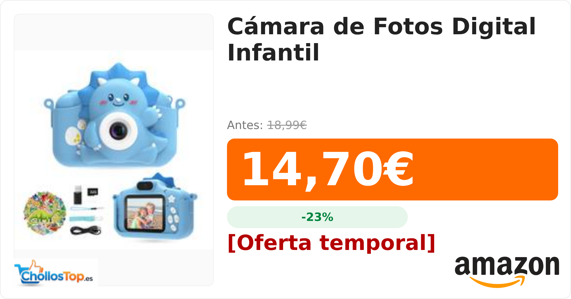 🔥 Cámara de Fotos Digital Infantil BY ChollosTopEs septiembre 9, 2025 Cámara de Fotos Digital Infantil 💰 Precio actual: 14.7€ 🪙 Antes: 18.99€ 📉 Descuento: -23% Ir al chollo