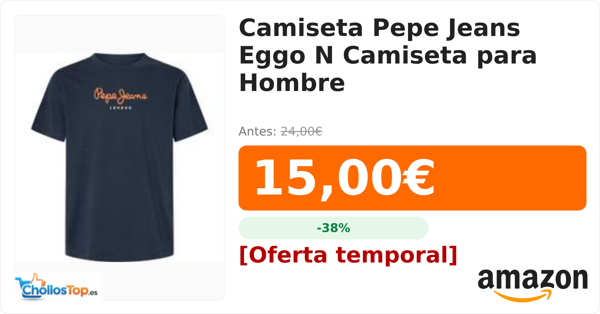 🔥 Camiseta Pepe Jeans Eggo N Camiseta para Hombre BY ChollosTopEs septiembre 9, 2025 Camiseta Pepe Jeans Eggo N Camiseta para Hombre 💰 Precio actual: 15€ 🪙 Antes: 24€ 📉 Descuento: -38% Ir al chollo