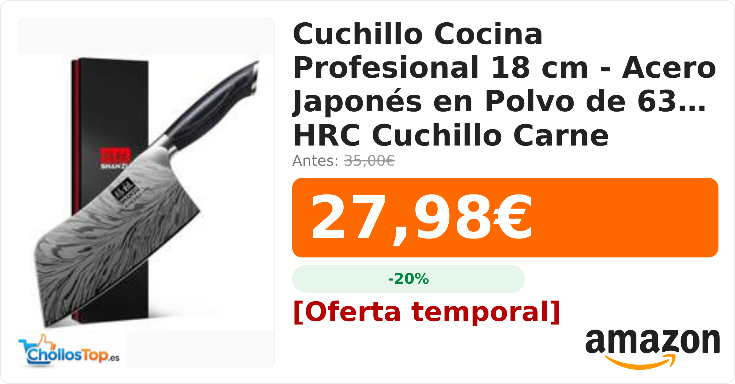 🔥 Cuchillo Cocina Profesional 18 cm – Acero Japonés en Polvo de 63 HRC Cuchillo Carne Afilado con Filo de 12°con Mango de Madera Pakka BY ChollosTopEs septiembre 9, 2025 Cuchillo Cocina Profesional 18 cm – Acero Japonés en Polvo de 63 HRC Cuchillo Carne Afilado con Filo de 12°con Mango de Madera Pakka 💰 Precio actual: 27.98€ 🪙 Antes: 35€ 📉 Descuento: -20% Ir al chollo