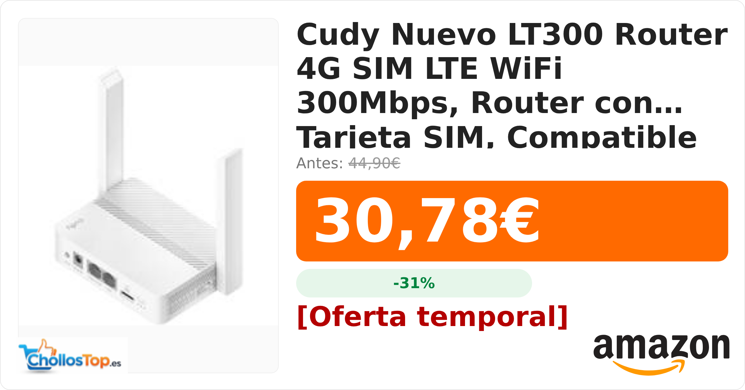 🔥 Cudy Nuevo LT300 Router 4G SIM LTE WiFi 300Mbps, Router con Tarjeta SIM, Compatible con Todos los operadores, 2×2 MIMO BY ChollosTopEs septiembre 8, 2025 Cudy Nuevo LT300 Router 4G SIM LTE WiFi 300Mbps, Router con Tarjeta SIM, Compatible con Todos los operadores, 2×2 MIMO 💰 Precio actual: 30.78€ 🪙 Antes: 44.9€ 📉 Descuento: -31% Ir al chollo