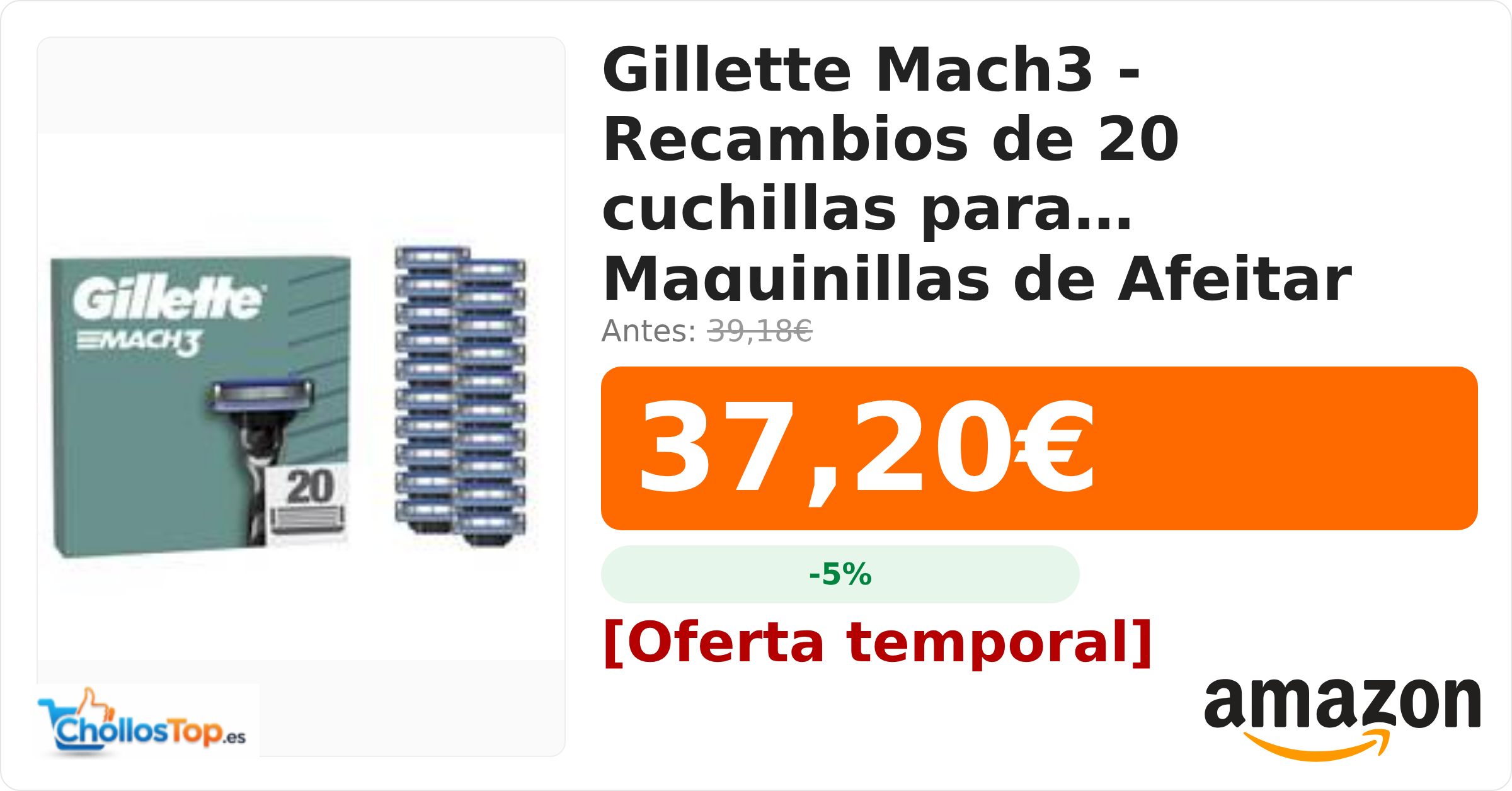 🔥 Gillette Mach3 – Recambios de 20 cuchillas para Maquinillas de Afeitar BY ChollosTopEs septiembre 8, 2025 Gillette Mach3 – Recambios de 20 cuchillas para Maquinillas de Afeitar 💰 Precio actual: 37.2€ 🪙 Antes: 39.18€ 📉 Descuento: -5% Ir al chollo