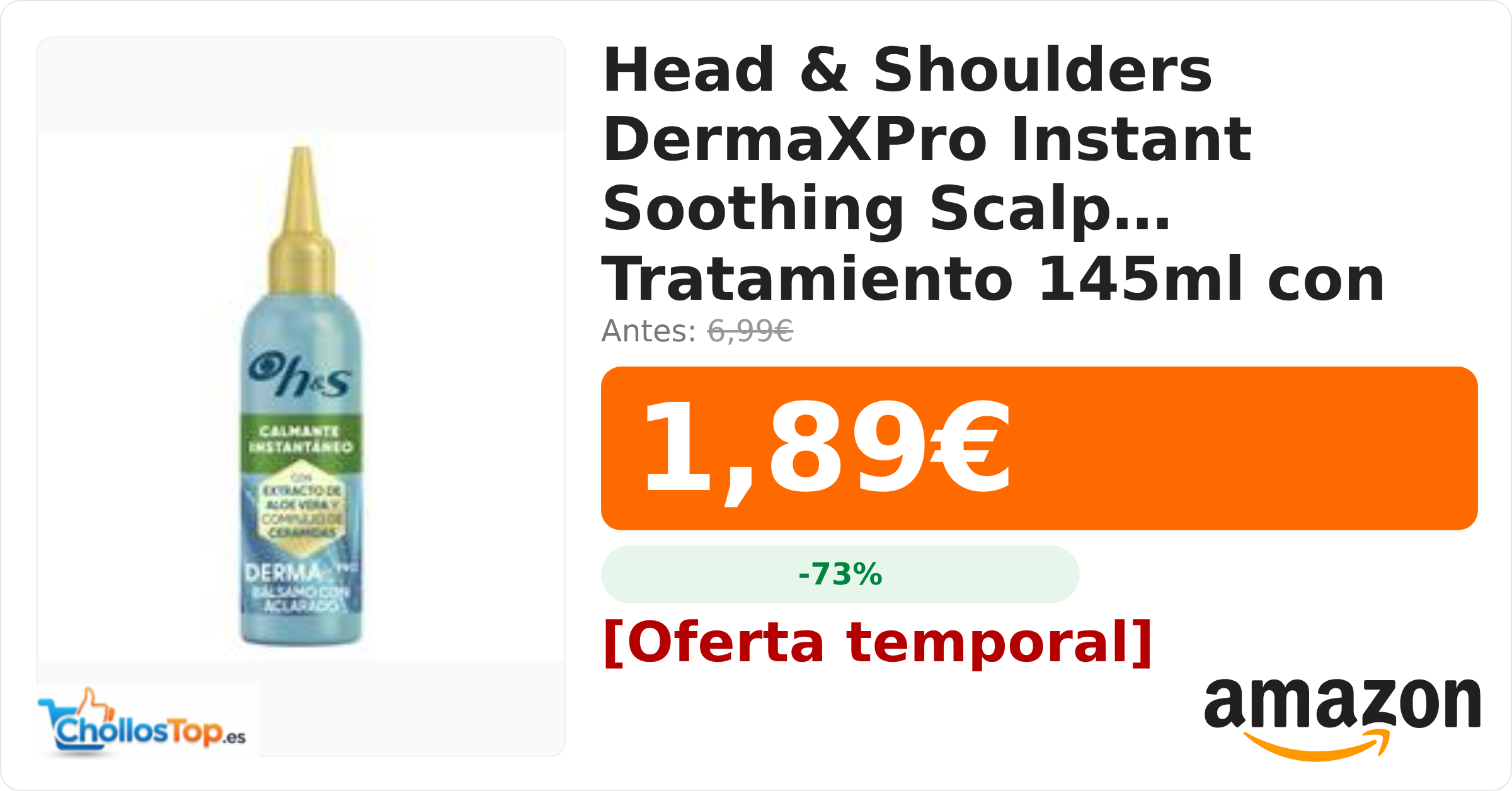 🔥 Head & Shoulders DermaXPro Instant Soothing Scalp Tratamiento 145ml con Extracto de Aloe Vera BY ChollosTopEs septiembre 10, 2025 Head & Shoulders DermaXPro Instant Soothing Scalp Tratamiento 145ml con Extracto de Aloe Vera 💰 Precio actual: 1.89€ 🪙 Antes: 6.99€ 📉 Descuento: -73% Ir al chollo