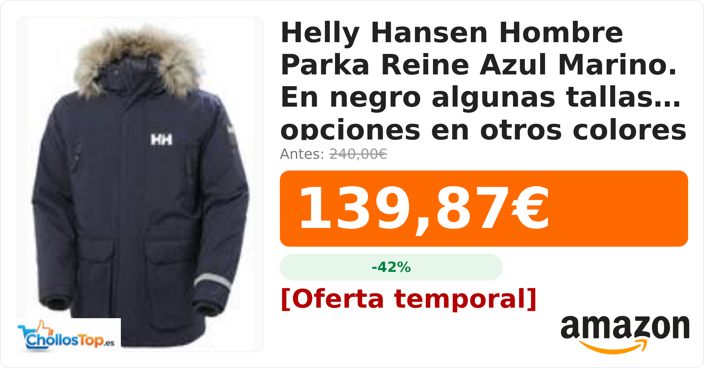 🔥 Helly Hansen Hombre Parka Reine Azul Marino. En negro algunas tallas y opciones en otros colores BY ChollosTopEs septiembre 9, 2025 Helly Hansen Hombre Parka Reine Azul Marino. En negro algunas tallas y opciones en otros colores 💰 Precio actual: 139.87€ 🪙 Antes: 240€ 📉 Descuento: -42% Ir al chollo