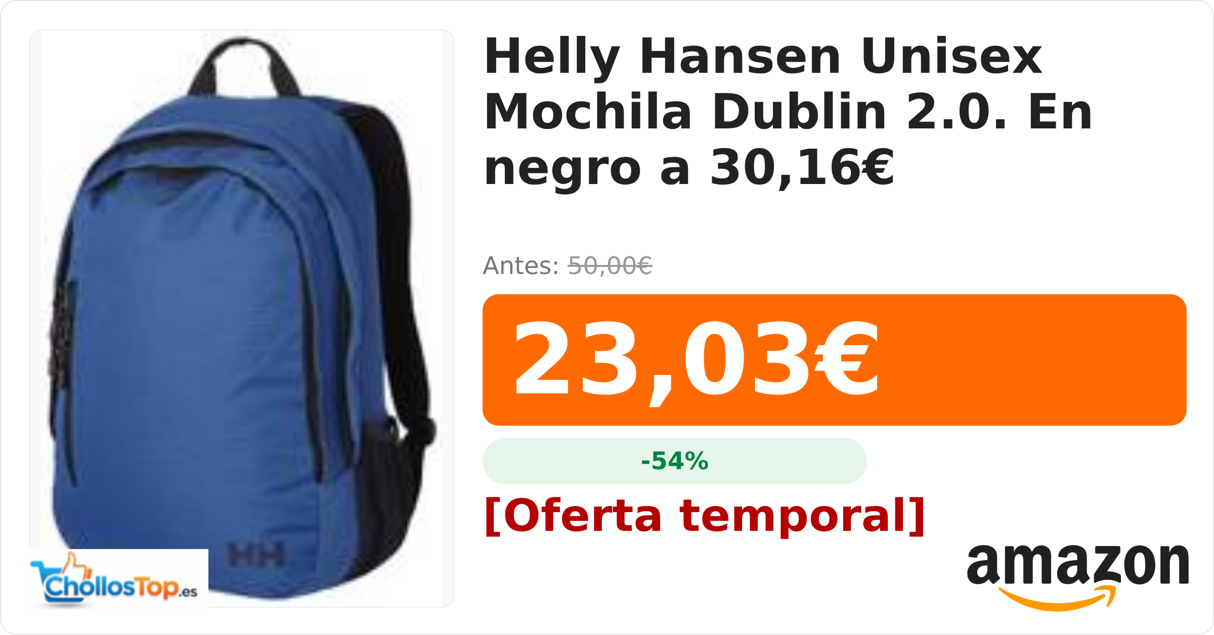 🔥 Helly Hansen Unisex Mochila Dublin 2.0. En negro a 30,16€ BY ChollosTopEs septiembre 9, 2025 Helly Hansen Unisex Mochila Dublin 2.0. En negro a 30,16€ 💰 Precio actual: 23.03€ 🪙 Antes: 50€ 📉 Descuento: -54% Ir al chollo