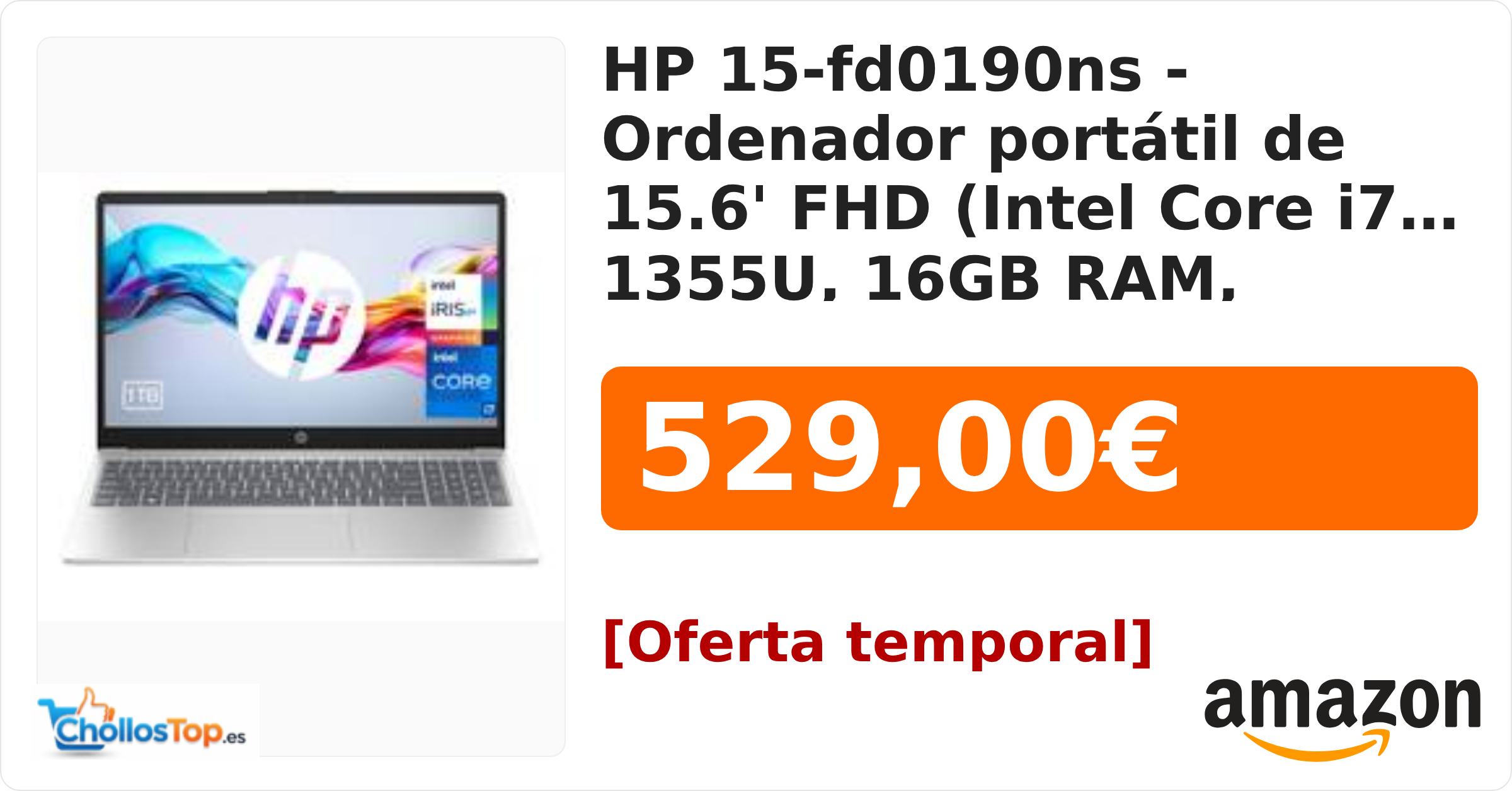 🔥 HP 15-fd0190ns – Ordenador portátil de 15.6" FHD (Intel Core i7-1355U, 16GB RAM, 512GB SSD, Intel Iris Xe Graphics, Sin Sistema Operativo) BY ChollosTopEs septiembre 9, 2025 HP 15-fd0190ns – Ordenador portátil de 15.6" FHD (Intel Core i7-1355U, 16GB RAM, 512GB SSD, Intel Iris Xe Graphics, Sin Sistema Operativo) 💰 Precio actual: 529€ Ir al chollo