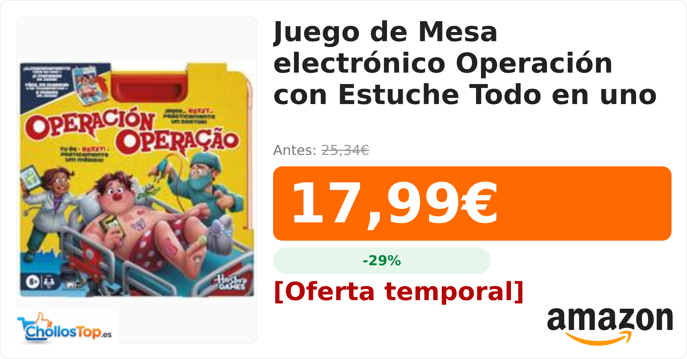 🔥 Juego de Mesa electrónico Operación con Estuche Todo en uno BY ChollosTopEs septiembre 9, 2025 Juego de Mesa electrónico Operación con Estuche Todo en uno 💰 Precio actual: 17.99€ 🪙 Antes: 25.34€ 📉 Descuento: -29% Ir al chollo