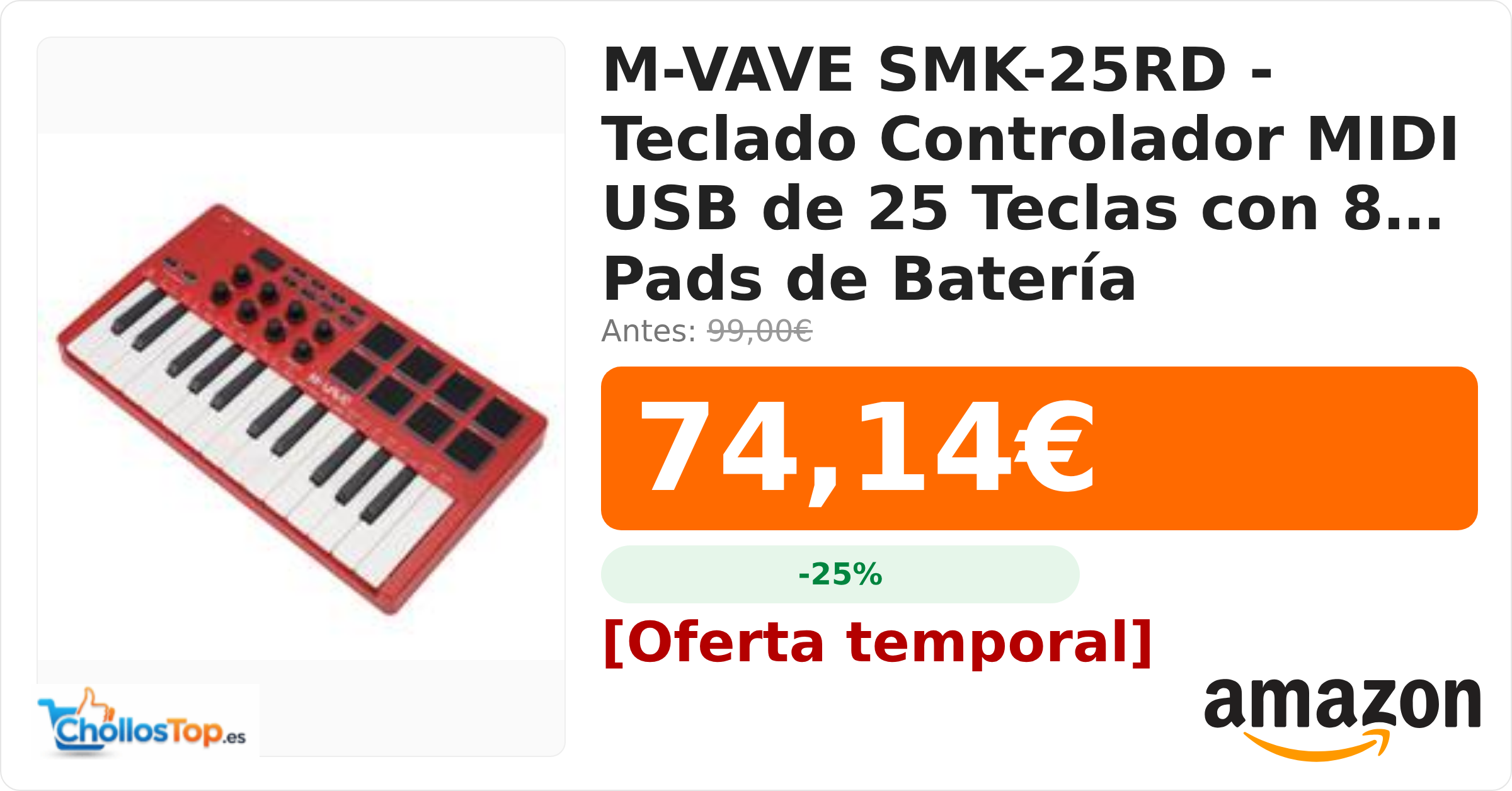 🔥 M-VAVE SMK-25RD – Teclado Controlador MIDI USB de 25 Teclas con 8 Pads de Batería Retroiluminados, Bluetooth, 8 Teclas,, Rojo BY ChollosTopEs septiembre 9, 2025 M-VAVE SMK-25RD – Teclado Controlador MIDI USB de 25 Teclas con 8 Pads de Batería Retroiluminados, Bluetooth, 8 Teclas,, Rojo 💰 Precio actual: 74.14€ 🪙 Antes: 99€ 📉 Descuento: -25% Ir al chollo