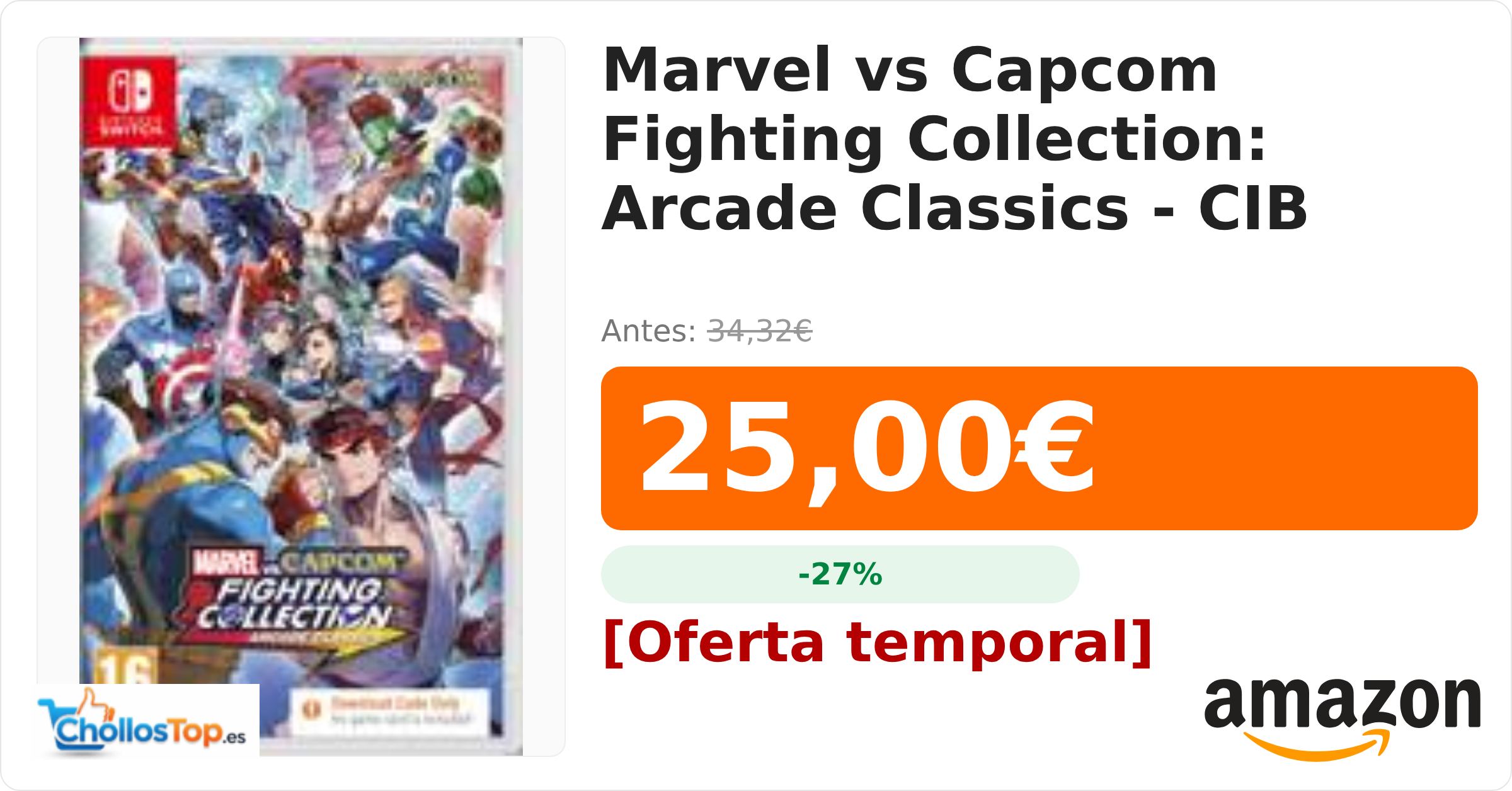 🔥 Marvel vs Capcom Fighting Collection: Arcade Classics – CIB BY ChollosTopEs septiembre 9, 2025 Marvel vs Capcom Fighting Collection: Arcade Classics – CIB 💰 Precio actual: 25€ 🪙 Antes: 34.32€ 📉 Descuento: -27% Ir al chollo