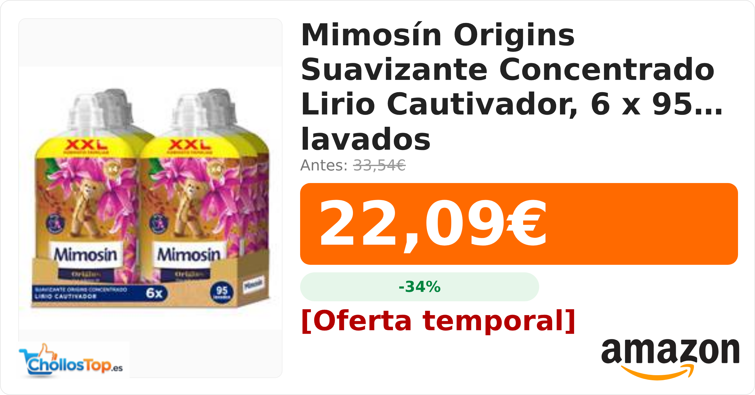 🔥 Mimosín Origins Suavizante Concentrado Lirio Cautivador, 6 x 95 lavados BY ChollosTopEs septiembre 9, 2025 Mimosín Origins Suavizante Concentrado Lirio Cautivador, 6 x 95 lavados 💰 Precio actual: 22.09€ 🪙 Antes: 33.54€ 📉 Descuento: -34% Ir al chollo