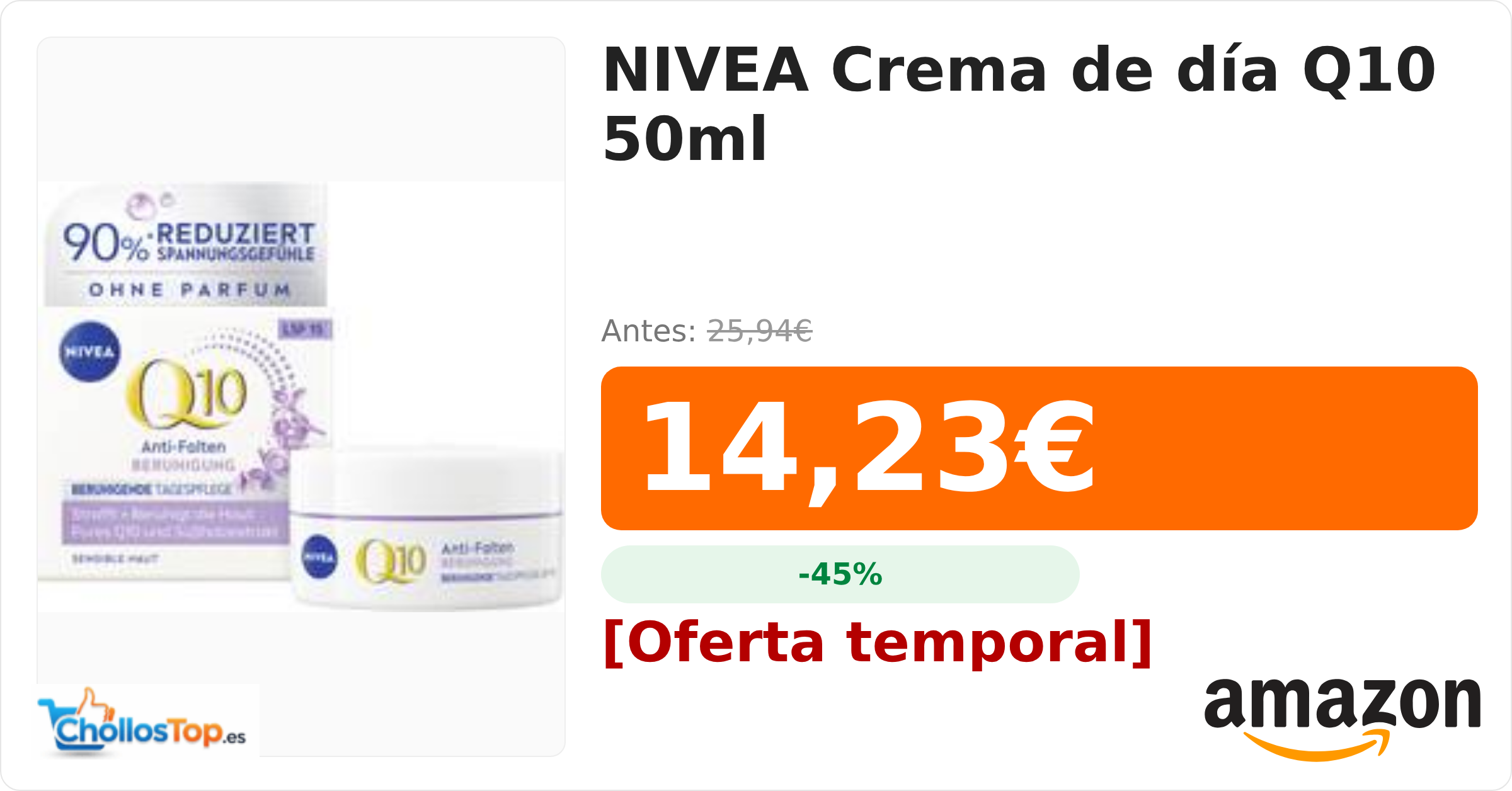 🔥 NIVEA Crema de día Q10 50ml BY ChollosTopEs septiembre 9, 2025 NIVEA Crema de día Q10 50ml 💰 Precio actual: 14.23€ 🪙 Antes: 25.94€ 📉 Descuento: -45% Ir al chollo