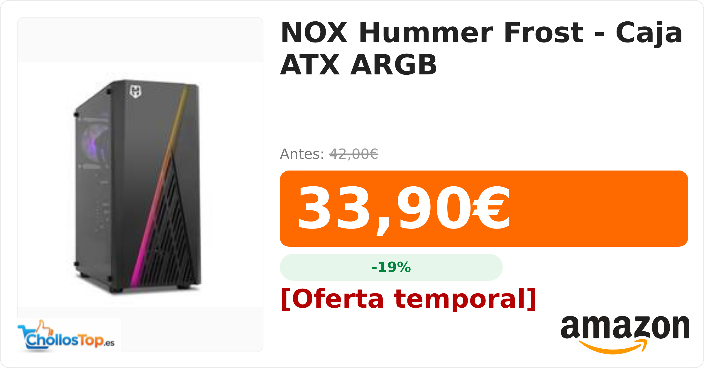 🔥 NOX Hummer Frost – Caja ATX ARGB BY ChollosTopEs septiembre 10, 2025 NOX Hummer Frost – Caja ATX ARGB 💰 Precio actual: 33.9€ 🪙 Antes: 42€ 📉 Descuento: -19% Ir al chollo