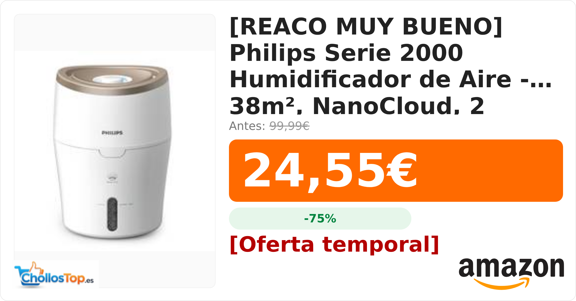 🔥 [REACO MUY BUENO] Philips Serie 2000 Humidificador de Aire – 38m², NanoCloud, 2 Velocidades, Tanque 2L BY ChollosTopEs septiembre 9, 2025 [REACO MUY BUENO] Philips Serie 2000 Humidificador de Aire – 38m², NanoCloud, 2 Velocidades, Tanque 2L 💰 Precio actual: 24.55€ 🪙 Antes: 99.99€ 📉 Descuento: -75% Ir al chollo