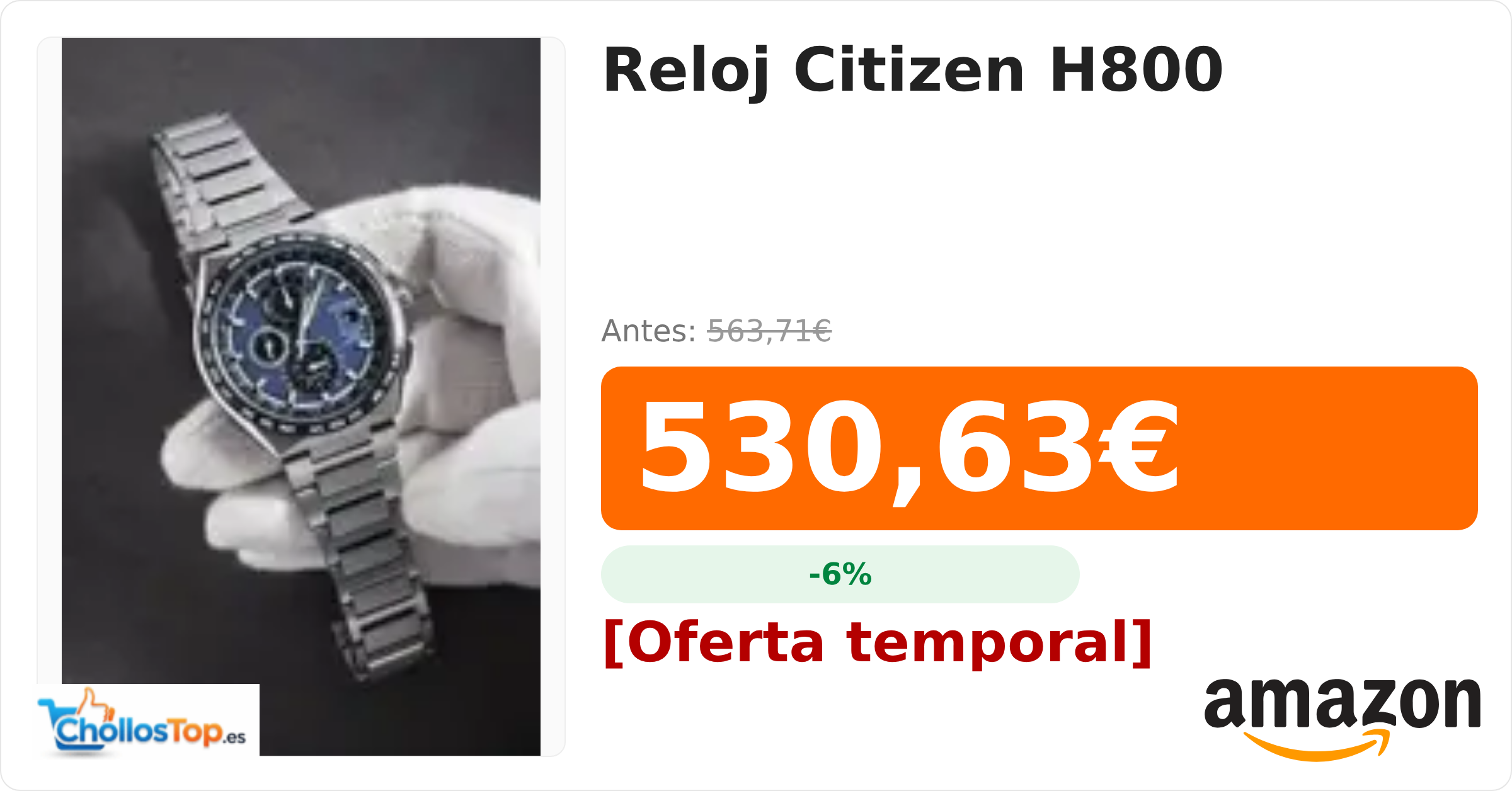 🔥 Reloj Citizen H800 BY ChollosTopEs septiembre 8, 2025 Reloj Citizen H800 💰 Precio actual: 530.63€ 🪙 Antes: 563.71€ 📉 Descuento: -6% Ir al chollo
