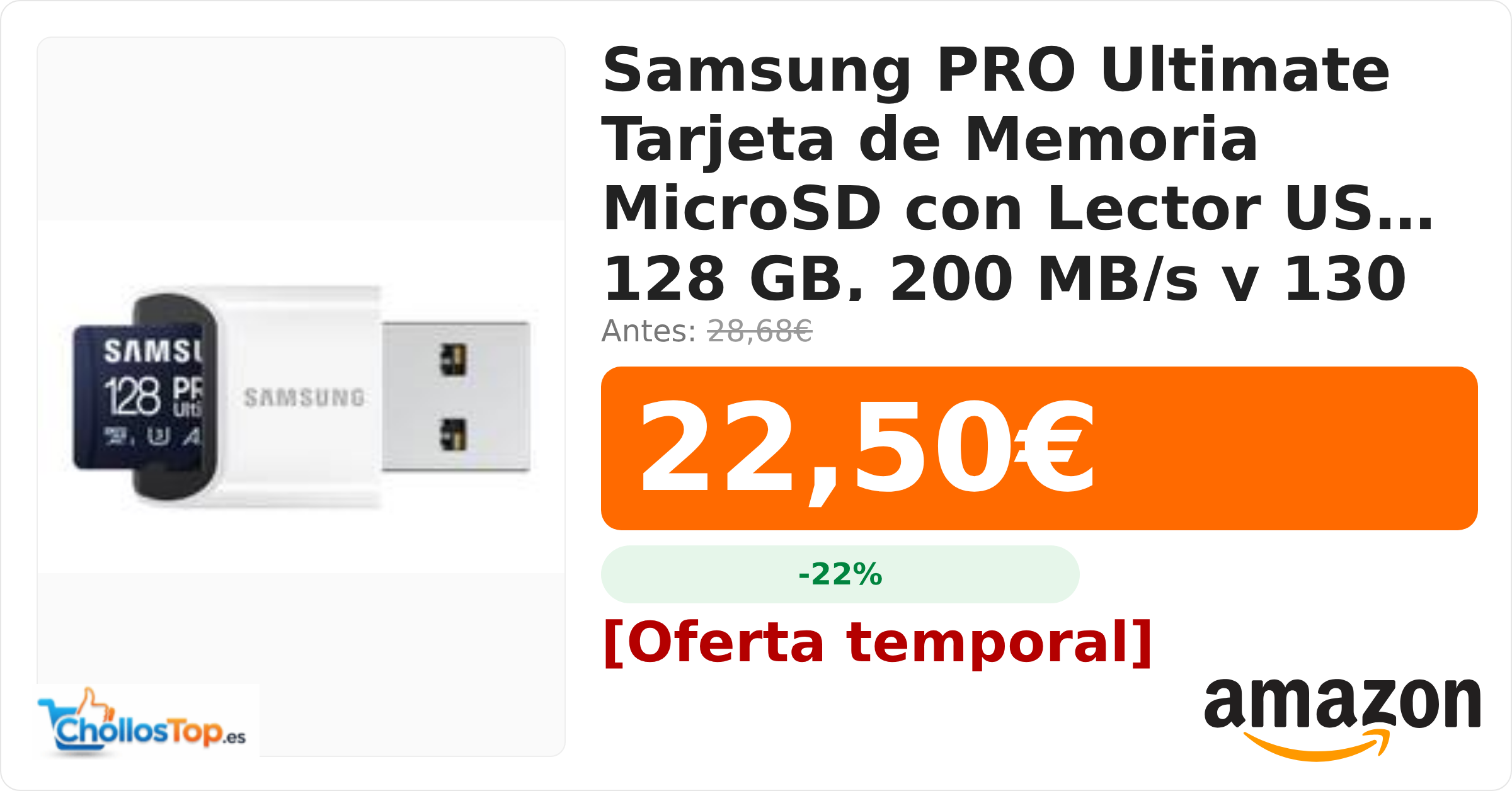 🔥 Samsung PRO Ultimate Tarjeta de Memoria MicroSD con Lector USB, 128 GB, 200 MB/s y 130 MB/s BY ChollosTopEs septiembre 8, 2025 Samsung PRO Ultimate Tarjeta de Memoria MicroSD con Lector USB, 128 GB, 200 MB/s y 130 MB/s 💰 Precio actual: 22.5€ 🪙 Antes: 28.68€ 📉 Descuento: -22% Ir al chollo