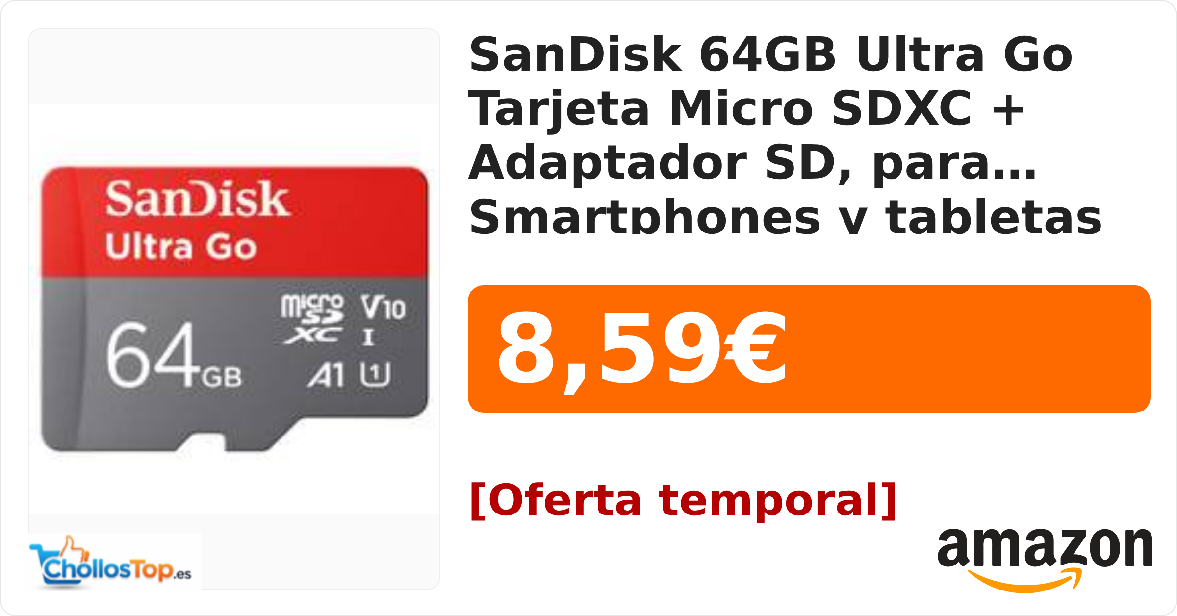 🔥 SanDisk 64GB Ultra Go Tarjeta Micro SDXC + Adaptador SD, para Smartphones y tabletas Android, hasta 150 MB/s, Video Full HDD, V10, A1, UHS-I