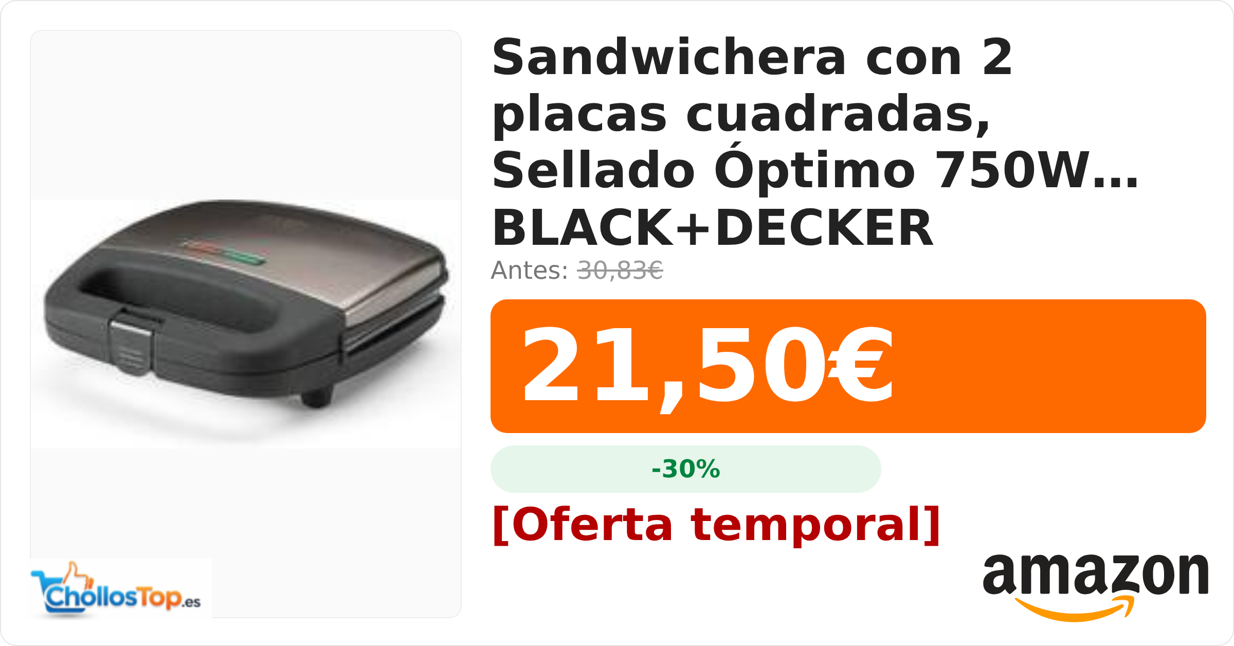 🔥 Sandwichera con 2 placas cuadradas, Sellado Óptimo 750W BLACK+DECKER BY ChollosTopEs septiembre 9, 2025 Sandwichera con 2 placas cuadradas, Sellado Óptimo 750W BLACK+DECKER 💰 Precio actual: 21.5€ 🪙 Antes: 30.83€ 📉 Descuento: -30% Ir al chollo