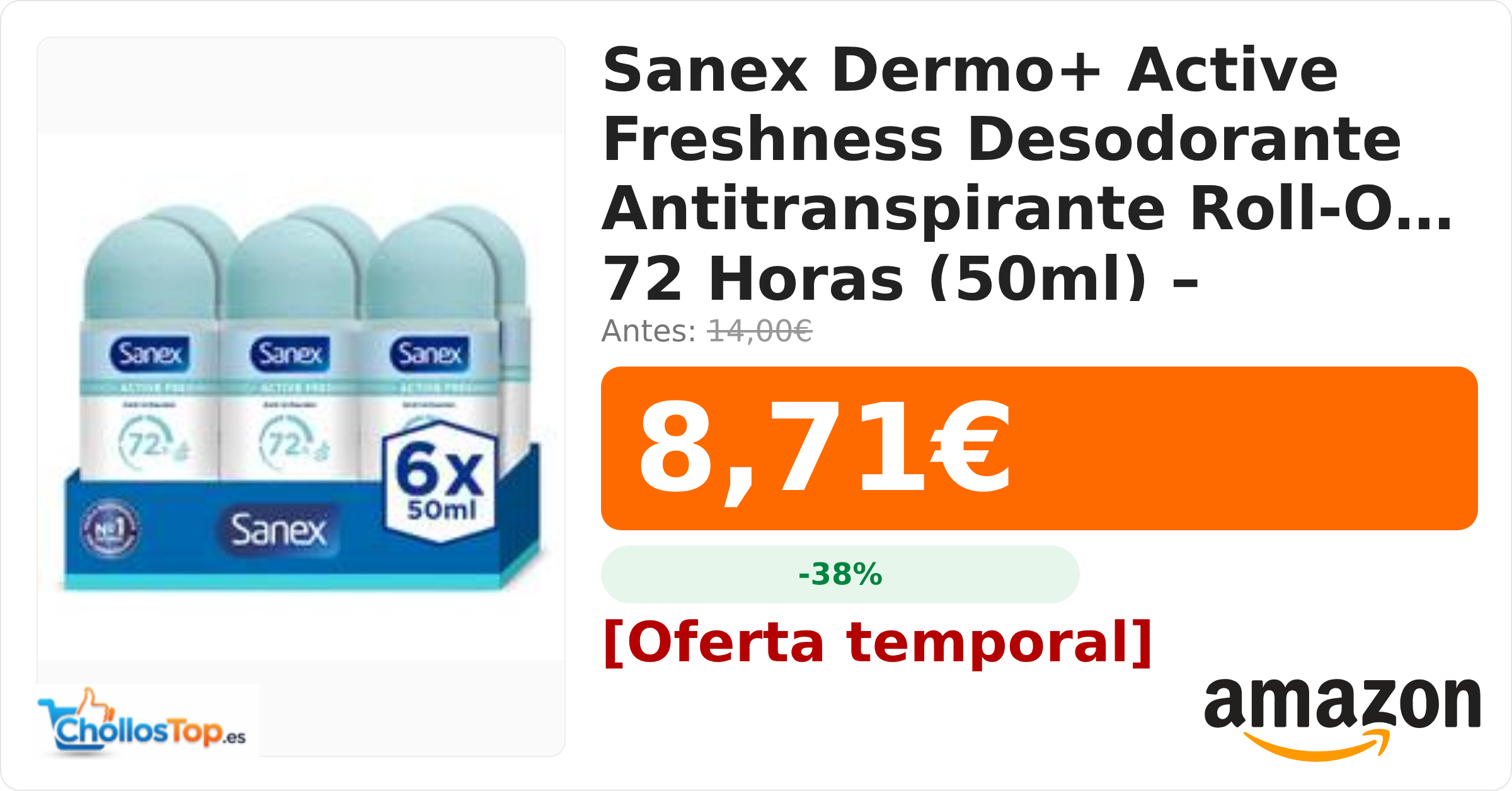 🔥 Sanex Dermo+ Active Freshness Desodorante Antitranspirante Roll-On 72 Horas (50ml) – protección eficaz contra el sudor y el mal olor BY ChollosTopEs septiembre 9, 2025 Sanex Dermo+ Active Freshness Desodorante Antitranspirante Roll-On 72 Horas (50ml) – protección eficaz contra el sudor y el mal olor 💰 Precio actual: 8.71€ 🪙 Antes: 14€ 📉 Descuento: -38% Ir al chollo