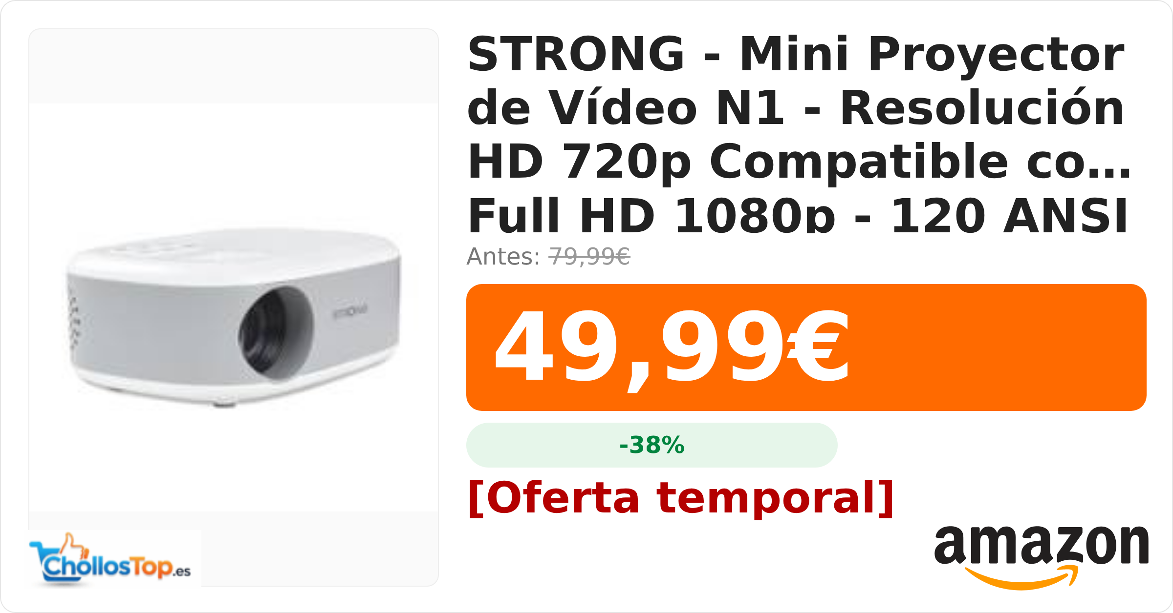 STRONG – Mini Proyector de Vídeo N1 – Resolución HD 720p Compatible con Full HD 1080p – 120 ANSI Lúmenes – 0,9 a 6,2 m – HDMI/USB/AV