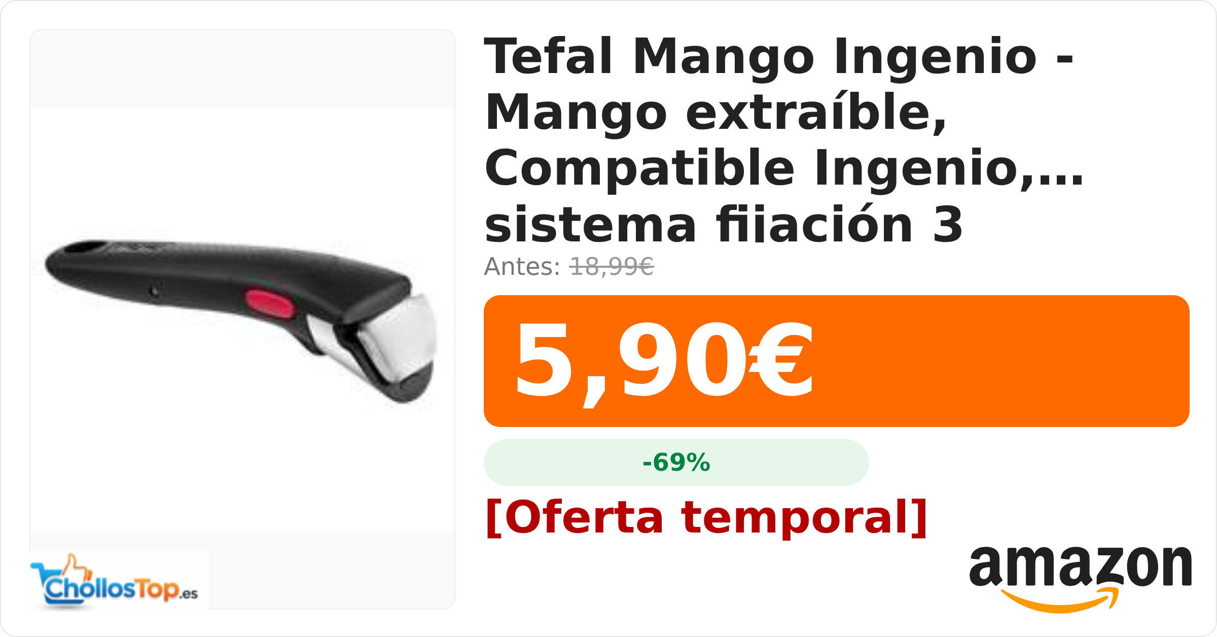 Tefal Mango Ingenio – Mango extraíble, Compatible Ingenio, sistema fijación 3 puntos, soporta hasta 10 kg de carga, mango resistente