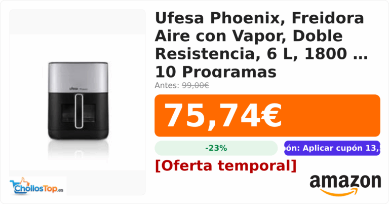 Ufesa Phoenix, Freidora Aire con Vapor, Doble Resistencia, 6 L, 1800 W, 10 Programas💰 Precio actual: 75.74€🪙 Antes: 99€📉 Descuento: -23%🏷️ Cupón: Aplicar cupón 13,56€Ir...