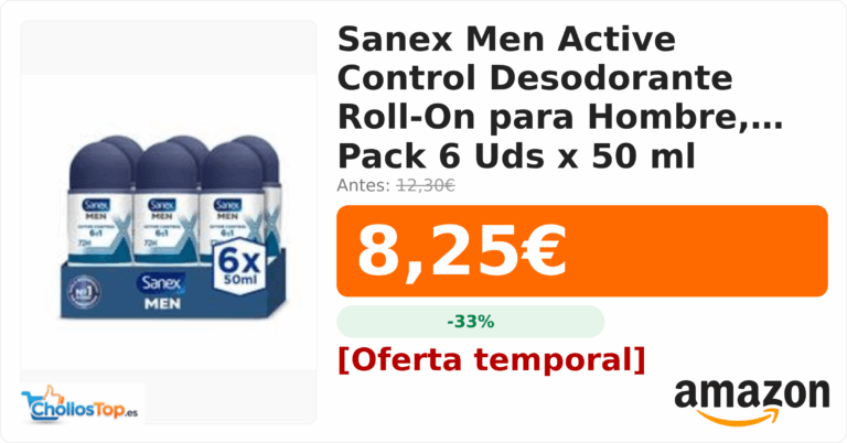 Sanex Men Active Control Desodorante Roll-On para Hombre, Pack 6 Uds x 50 ml💰 Precio actual: 8.25€🪙 Antes: 12.3€📉 Descuento: -33%Ir al chollo