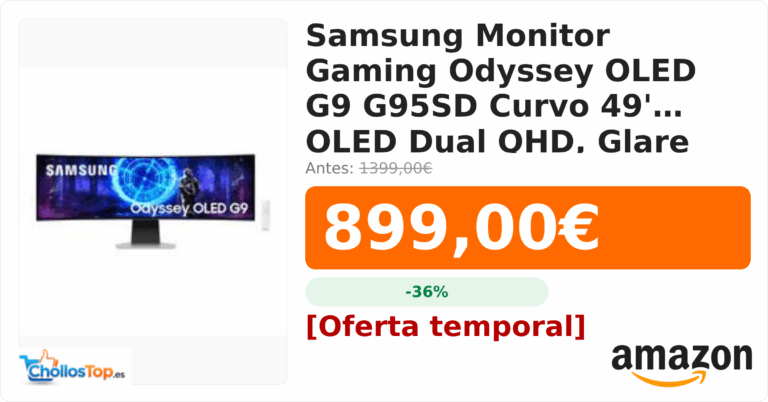 Samsung Monitor Gaming Odyssey OLED G9 G95SD Curvo 49" OLED Dual QHD, Glare Free,tasa de Respuesta 0,03ms,tasa refresco 240Hz💰 Precio actual: 899€🪙 Antes: 1399€📉 Descuento:...