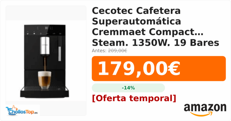 Cecotec Cafetera Superautomática Cremmaet Compact Steam. 1350W, 19 Bares💰 Precio actual: 179€🪙 Antes: 209€📉 Descuento: -14%Ir al chollo