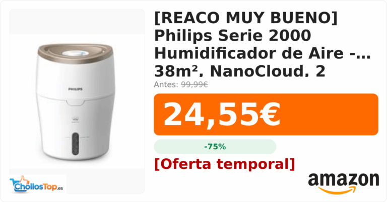[REACO MUY BUENO] Philips Serie 2000 Humidificador de Aire - 38m², NanoCloud, 2 Velocidades, Tanque 2L💰 Precio actual: 24.55€🪙 Antes: 99.99€📉 Descuento: -75%Ir al chollo