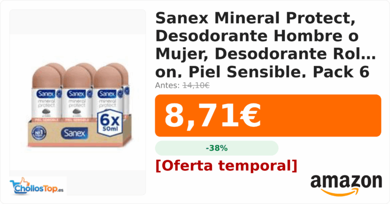 Sanex Mineral Protect, Desodorante Hombre o Mujer, Desodorante Roll-on, Piel Sensible, Pack 6 uds x 50ml💰 Precio actual: 8.71€🪙 Antes: 14.1€📉 Descuento: -38%Ir al chollo