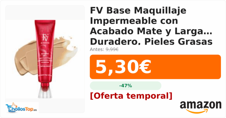 FV Base Maquillaje Impermeable con Acabado Mate y Larga Duradero, Pieles Grasas y Mixtas, 30g, Beige💰 Precio actual: 5.3€🪙 Antes: 9.99€📉 Descuento: -47%Ir al chollo