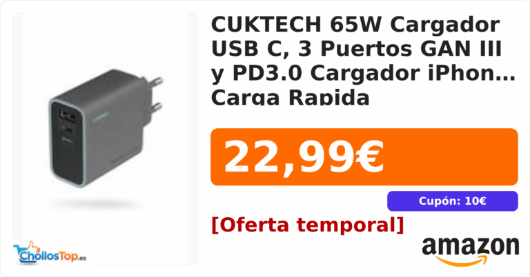 CUKTECH 65W Cargador USB C, 3 Puertos GAN III y PD3.0 Cargador iPhone Carga Rapida💰 Precio actual: 22.99€🏷️ Cupón: 10€Ir al chollo