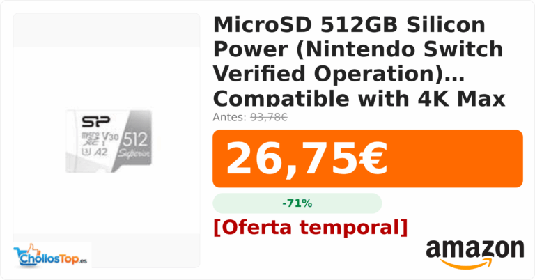 MicroSD 512GB Silicon Power (Nintendo Switch Verified Operation) Compatible with 4K Max Speed 100MB/s SP512GBSTXDA2V20SP💰 Precio actual: 26.75€🪙 Antes: 93.78€📉 Descuento: -71%Ir al chollo