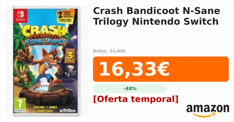 Crash Bandicoot N-Sane Trilogy Nintendo Switch💰 Precio actual: 16.33€🪙 Antes: 31.49€📉 Descuento: -48%Ir al chollo