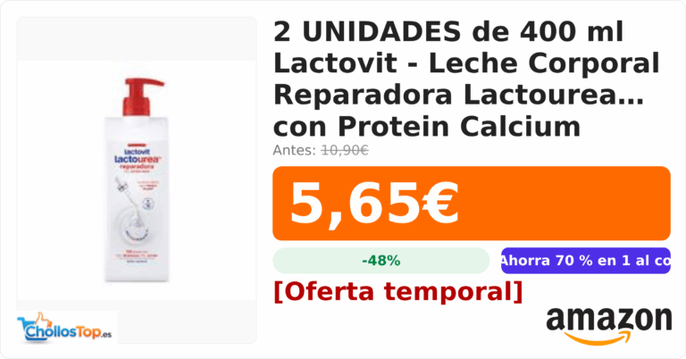 2 UNIDADES de 400 ml Lactovit - Leche Corporal Reparadora Lactourea con Protein Calcium (recurrente 5,36)💰 Precio actual: 5.65€🪙 Antes: 10.9€📉 Descuento: -48%🏷️ Cupón: Ahorra...
