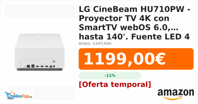 LG CineBeam HU710PW - Proyector TV 4K con SmartTV webOS 6.0, hasta 140", Fuente LED 4 Canales, 2.000 lúmenes, Resolución 3840x2160💰 Precio actual: 1199€🪙 Antes:...