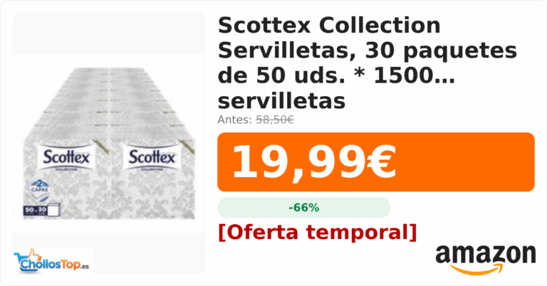 Scottex Collection Servilletas, 30 paquetes de 50 uds. * 1500 servilletas💰 Precio actual: 19.99€🪙 Antes: 58.5€📉 Descuento: -66%Ir al chollo