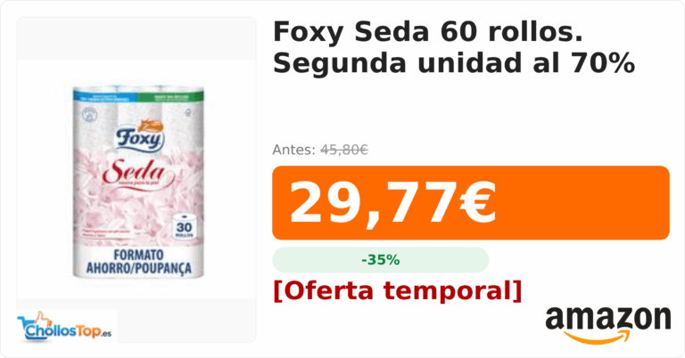 Foxy Seda 60 rollos. Segunda unidad al 70%💰 Precio actual: 29.77€🪙 Antes: 45.8€📉 Descuento: -35%Ir al chollo