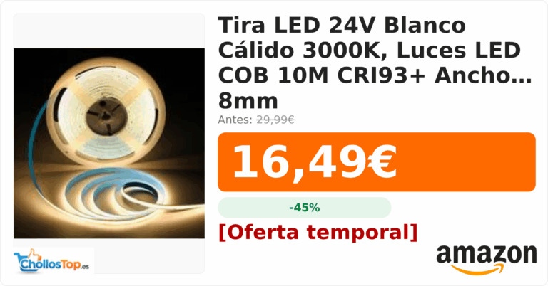 Tira LED 24V Blanco Cálido 3000K, Luces LED COB 10M CRI93+ Ancho 8mm💰 Precio actual: 16.49€🪙 Antes: 29.99€📉 Descuento: -45%Ir al chollo