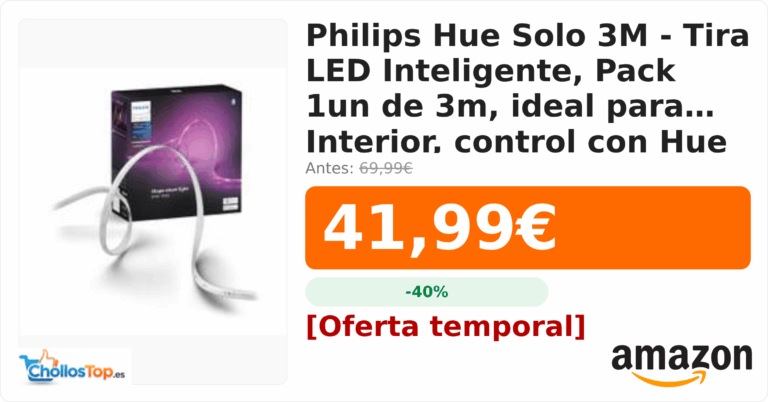 Philips Hue Solo 3M - Tira LED Inteligente, Pack 1un de 3m, ideal para Interior, control con Hue App💰 Precio actual: 41.99€🪙 Antes: 69.99€📉 Descuento:...
