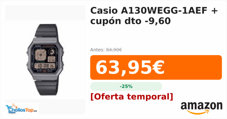 Casio A130WEGG-1AEF + cupón dto -9,60💰 Precio actual: 63.95€🪙 Antes: 84.9€📉 Descuento: -25%Ir al chollo