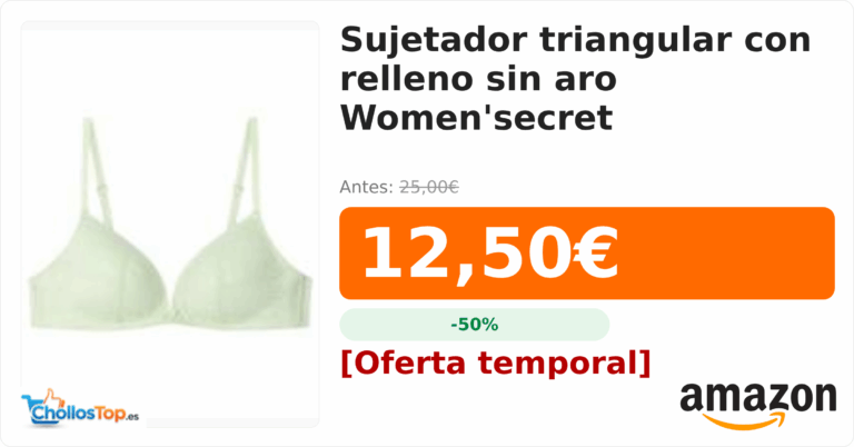 Sujetador triangular con relleno sin aro Women'secret💰 Precio actual: 12.5€🪙 Antes: 25€📉 Descuento: -50%Ir al chollo