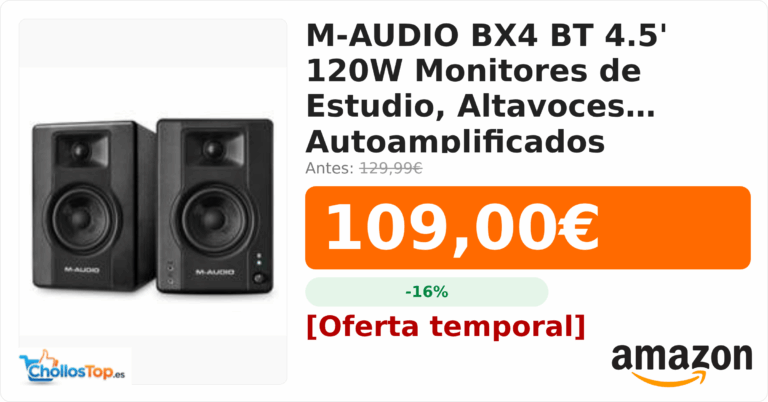 M-AUDIO BX4 BT 4.5" 120W Monitores de Estudio, Altavoces Autoamplificados Bluetooth para PC para producción Musical, Juegos💰 Precio actual: 109€🪙 Antes: 129.99€📉 Descuento: -16%Ir al...