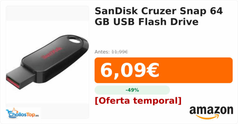 SanDisk Cruzer Snap 64 GB USB Flash Drive💰 Precio actual: 6.09€🪙 Antes: 11.99€📉 Descuento: -49%Ir al chollo