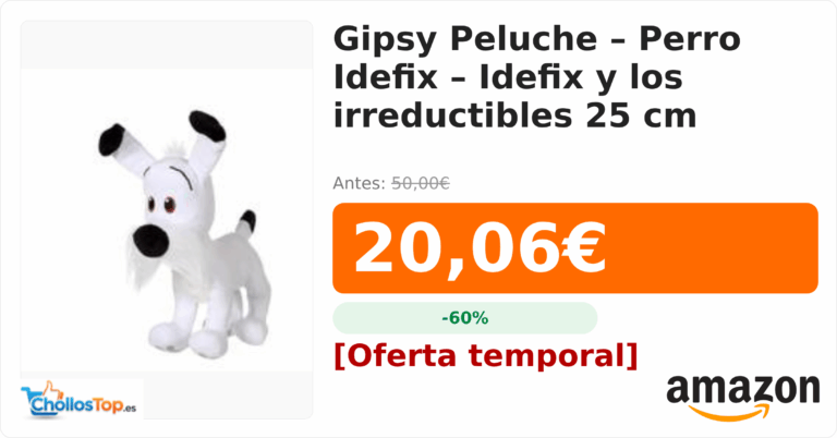 Gipsy Peluche – Perro Idefix – Idefix y los irreductibles 25 cm💰 Precio actual: 20.06€🪙 Antes: 50€📉 Descuento: -60%Ir al chollo