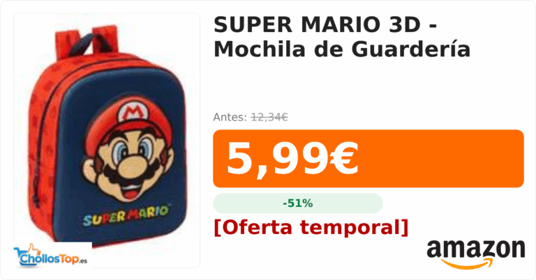 SUPER MARIO 3D - Mochila de Guardería💰 Precio actual: 5.99€🪙 Antes: 12.34€📉 Descuento: -51%Ir al chollo