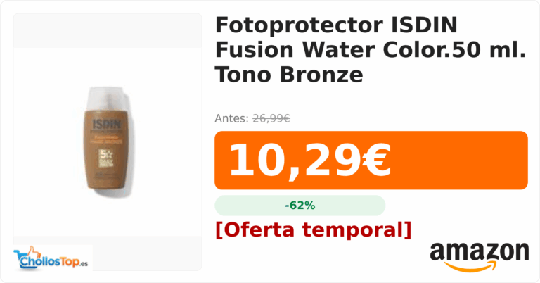 Fotoprotector ISDIN Fusion Water Color.50 ml. Tono Bronze💰 Precio actual: 10.29€🪙 Antes: 26.99€📉 Descuento: -62%Ir al chollo